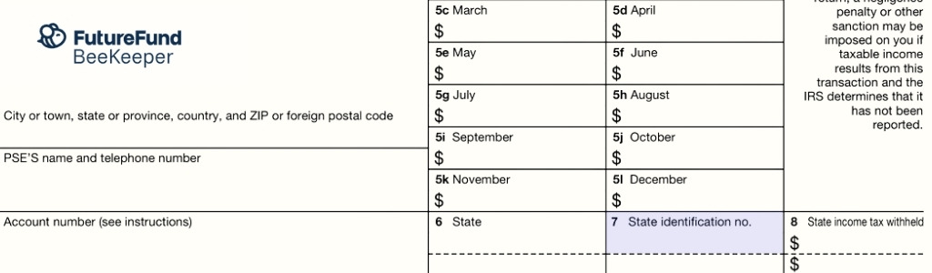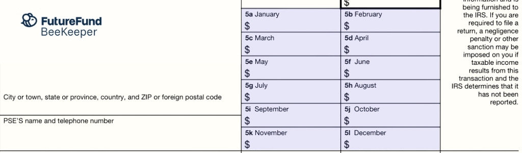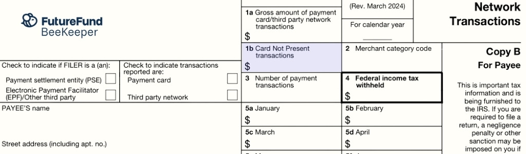 The IRS uses Form 1099-K to track payments processed by cards and online platforms like FutureFund. It shows the gross amount of payments that flowed through those systems to your PTA over the calendar year.